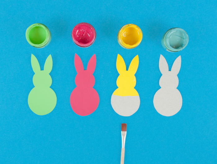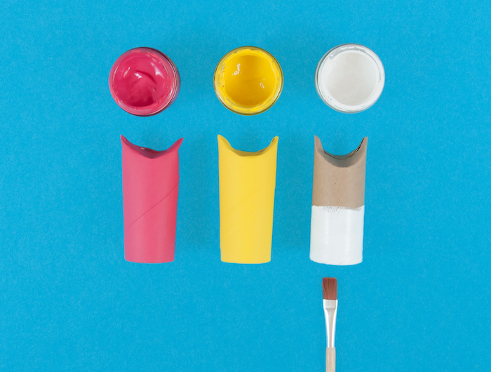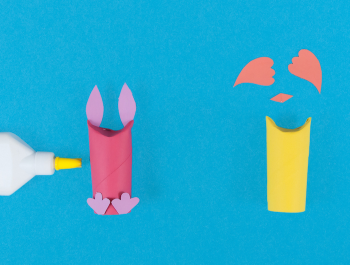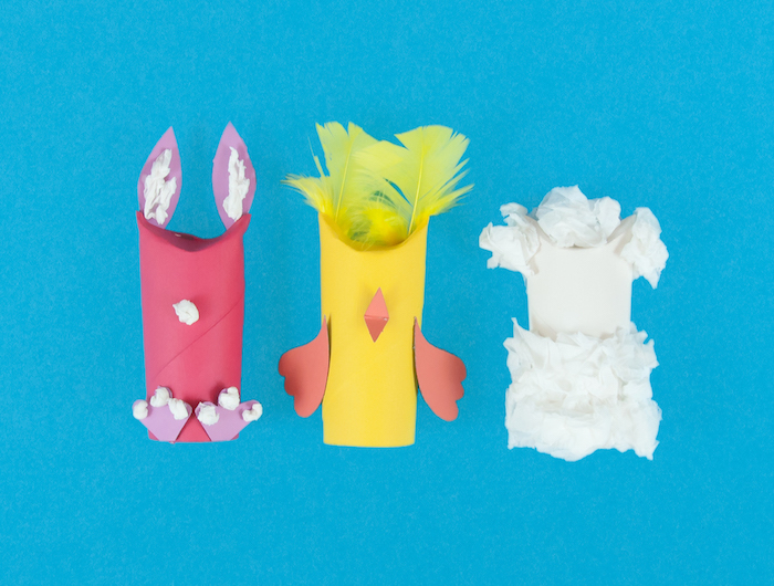 Then paint each toilet roll in a different colour – pink for the bunny, yellow for the chick and white for the lamb – and leave to dry.