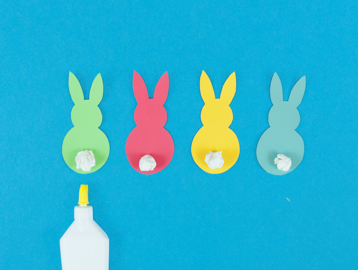 Tear and scrunch the soft tissue into small balls and glue to the bunnies’ bottoms. This is a great opportunity to have a giggle with your little ones!