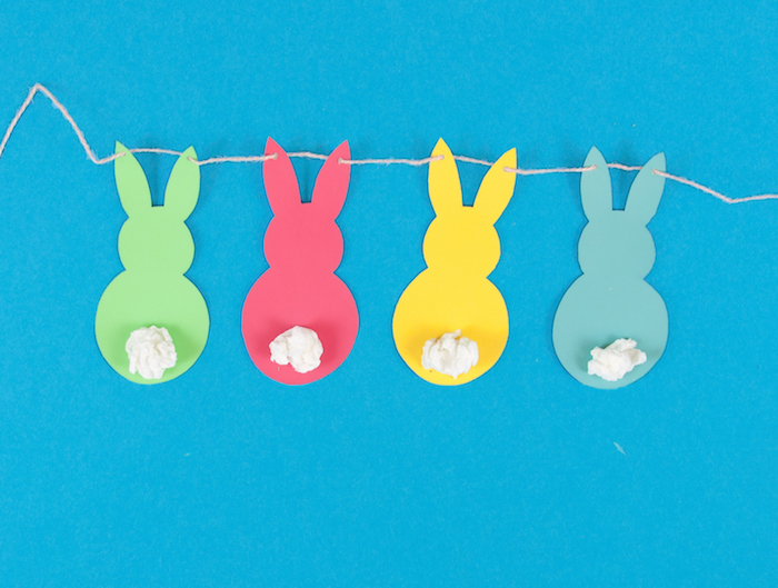 Our super cute bunny garland complete with soft Cushelle tissue tails is really easy and fun to make with the kids this spring. This is one of those easy Easter crafts for toddlers who love to paint.