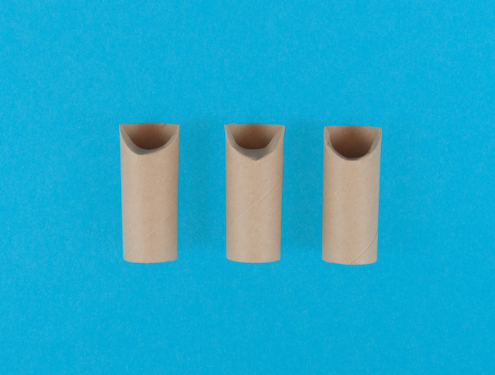 First, press down the sides of one end of each of the empty toilet rolls with your fingers.