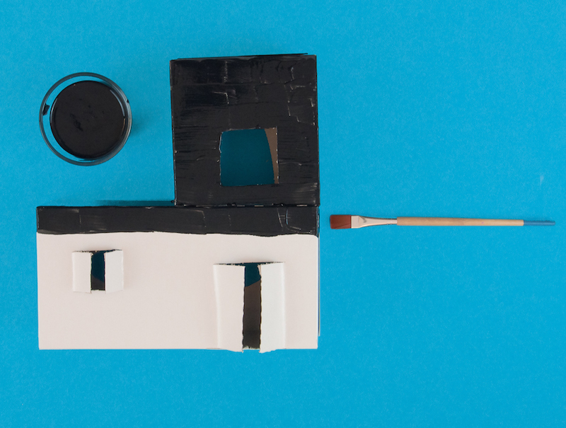 Next, carefully cut a door and windows with the craft knife and paint the boxes black.