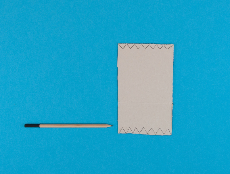 Now make the roof. Take the other half-box and cut it open with scissors. Trim it down to a rectangular shape, and draw a zigzag edge along the top and bottom an cut it out.