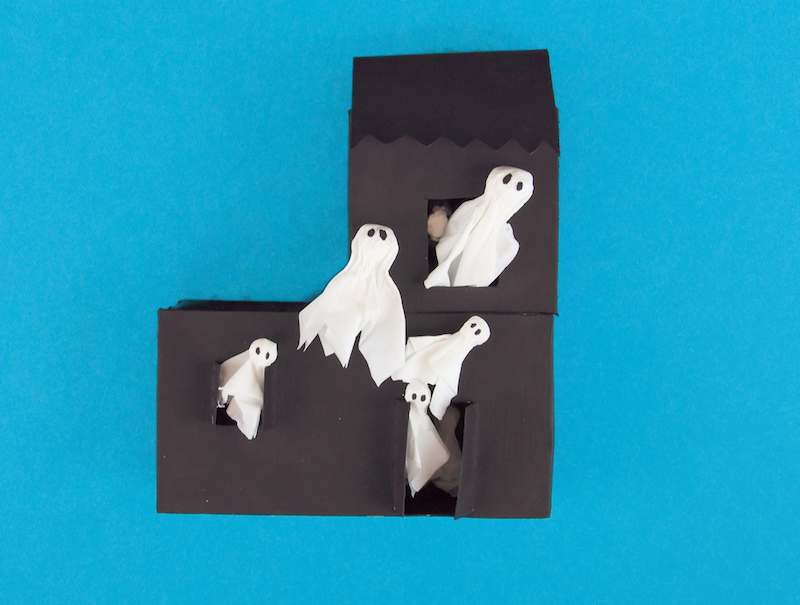 Soft Cushelle tissues make great fluffy ghosts. To make them, first tear and scrunch some tissue into little balls. Then cut squares of tissue and lay it over each ball, adding a little glue to hold them in place. Draw two eyes onto the ghosts with a black pen and then pop them inside the windows and door of the haunted house.