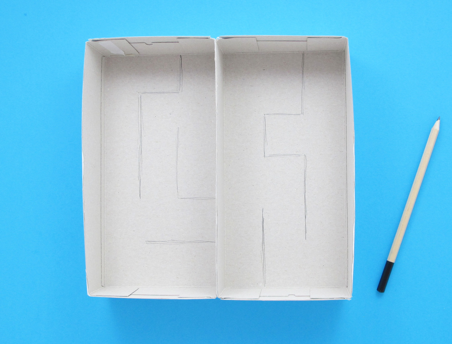 Now plan out your maze by drawing the position of the walls inside the bottom of the joined tissue boxes with a pencil.