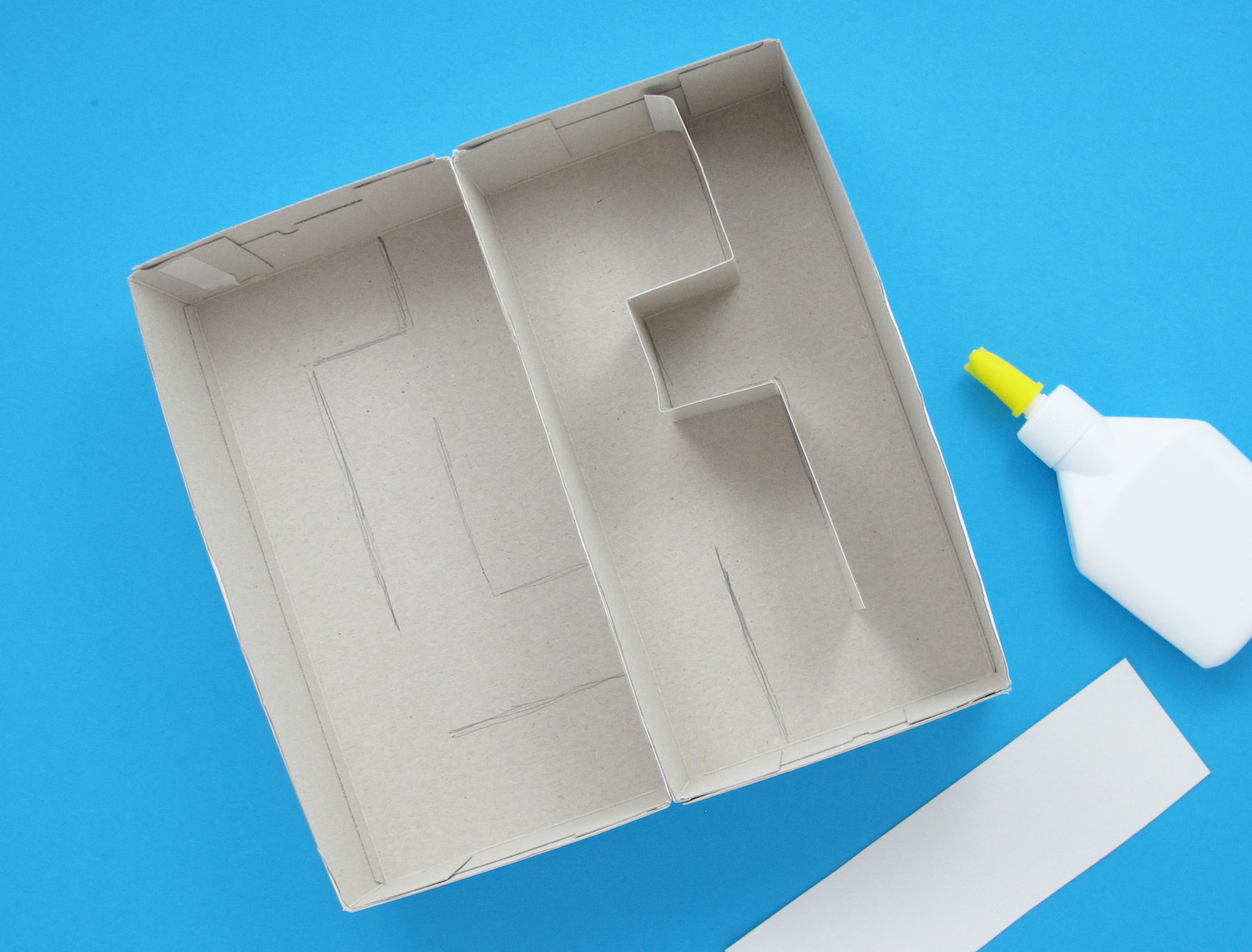 Cut open and flatten the third tissue box. Cut rectangular strips of card for the maze walls and bend them into shape.