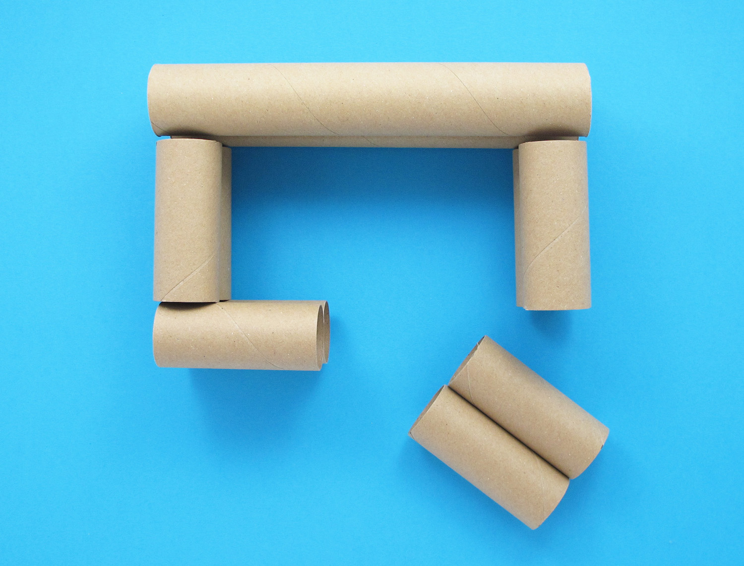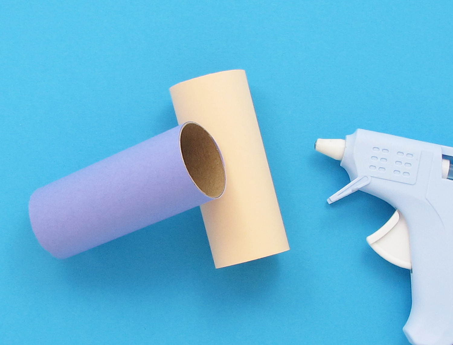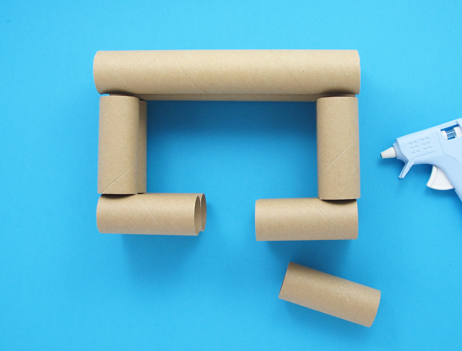 Rest the end of one roll in the middle of another, and stick in place with a hot glue gun. Repeat this to glue a second pair together.