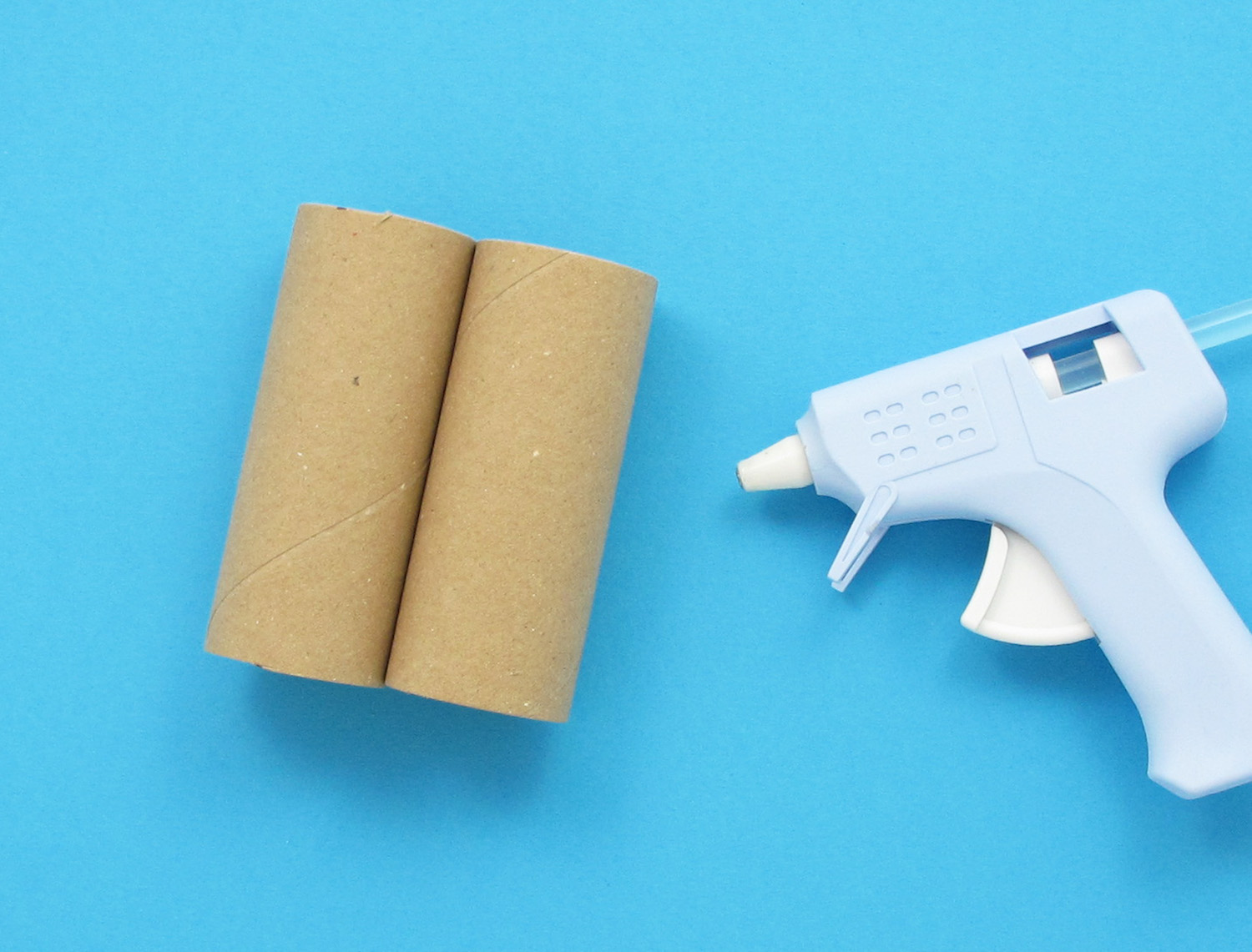 Place the last toilet roll across the middle of the two pairs, and stick in place with the hot glue gun.