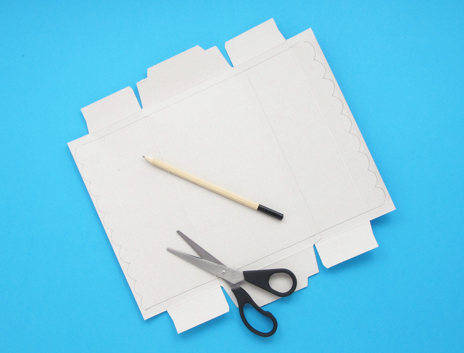 Cut open and flatten the empty tissue box. Draw a rectangular shaped roof with scalloped sides, and cut out.