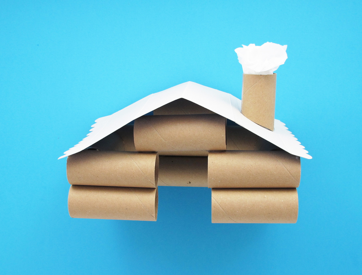 Fold the roof in half and glue to the top of the house. Stick the chimney on one side, and fill with scrunched up soft tissue.