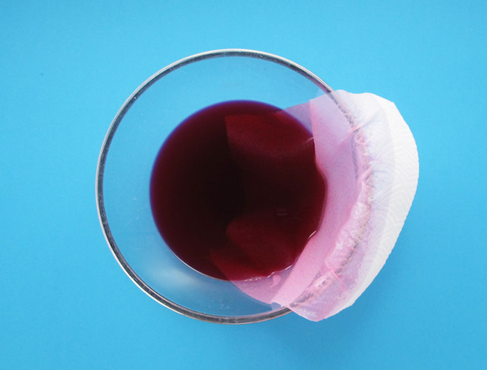 Pour some water into a bowl and add some pink food colouring. Mix, and then dip the first piece of kitchen towel in the coloured water. Remove and lay on some sheets of newspaper to dry. Repeat with yellow dye. This takes time, but the kids should be sufficiently fascinated by the process to stick with it!
