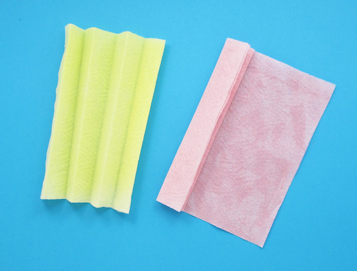 Once dry, fold each sheet of dyed kitchen towel in an accordion style, and then cut each folded bundle in half.