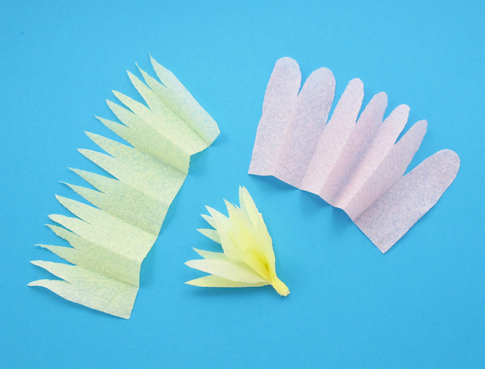 Draw rounded petal shapes on one end of each of the pink folded paper bundles, and pointed edge petals on the yellow. Cut out with scissors.