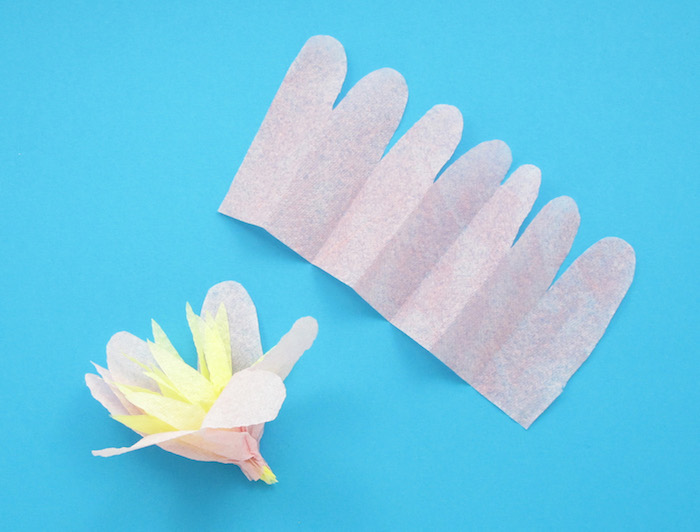 Wrap a pink petal layer around the yellow, and then repeat with a second layer. Scrunch at the bottom and tape as before.