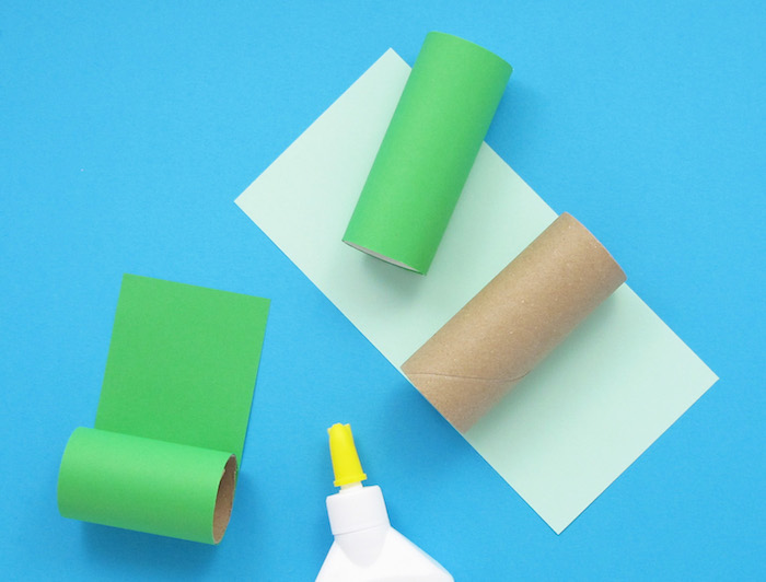To make the stems, first cut the toilet roll tubes into different sized lengths. Then measure and cut pieces of green paper to cover each, and roll and stick in place with glue. This sticky step is always a favourite with little ones!