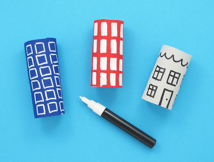Draw windows on the painted tubes with black and white marker pens, and add doors on a few of them. If you like, you can cut some of the doors open with scissors.